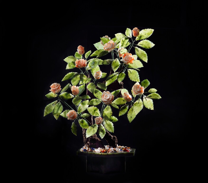 以台湾玉雕刻叶子,搭配以红珊瑚雕刻的花朵,真可谓巧夺天工。
