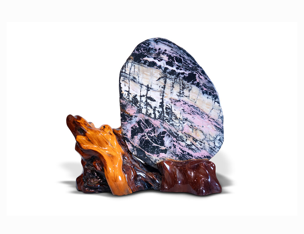 玫瑰石产於中央山脉奇莱山系花莲的立雾溪、三栈溪、木瓜溪等三条溪流。玫瑰石矿物学名为蔷薇辉石,其成分在化学上是一种锰矽酸盐类,锰元素常被钙、铁、镁、锌等元素所取代,表皮含氧化锰成分,氧化呈黑色,又因其色彩近似玫瑰花,故玩石者依其色彩命名为「玫瑰石」,纹路变化大常呈现国画山水,属於变质岩。