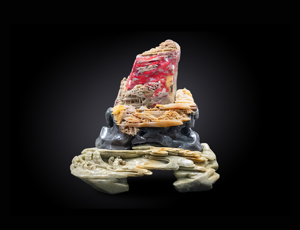 鸡血石多出於浙江省昌化县深山的石隙中,极不易得。当地地层中的金属矿物经地质变化、高热氧化融入石中,淡色石质中掺入殷红色,色泽悦目、鲜红如血。又因「鸡」与「吉」谐音,故名「鸡血石」,寓意吉祥。色泽鲜丽艳红者称作活血,为上品;呈褐色或暗红者,则谓死血,质较劣。