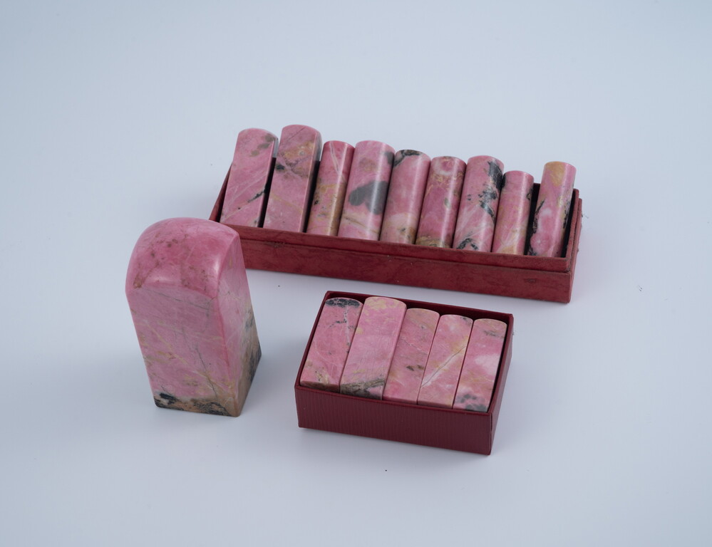 精选玫瑰石石材做为印章,寓意鸿运当头、吉祥如意。