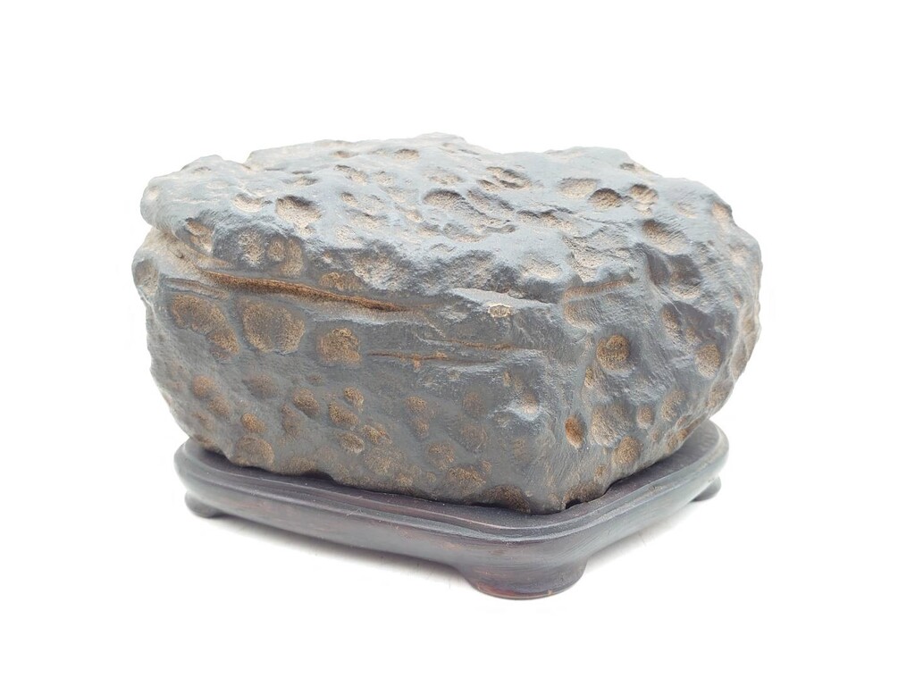 梨皮石之型成颇为困难,尤为此石之大苍点均衡,石型无相寂静,禅房中禅定摆设相当适宜。