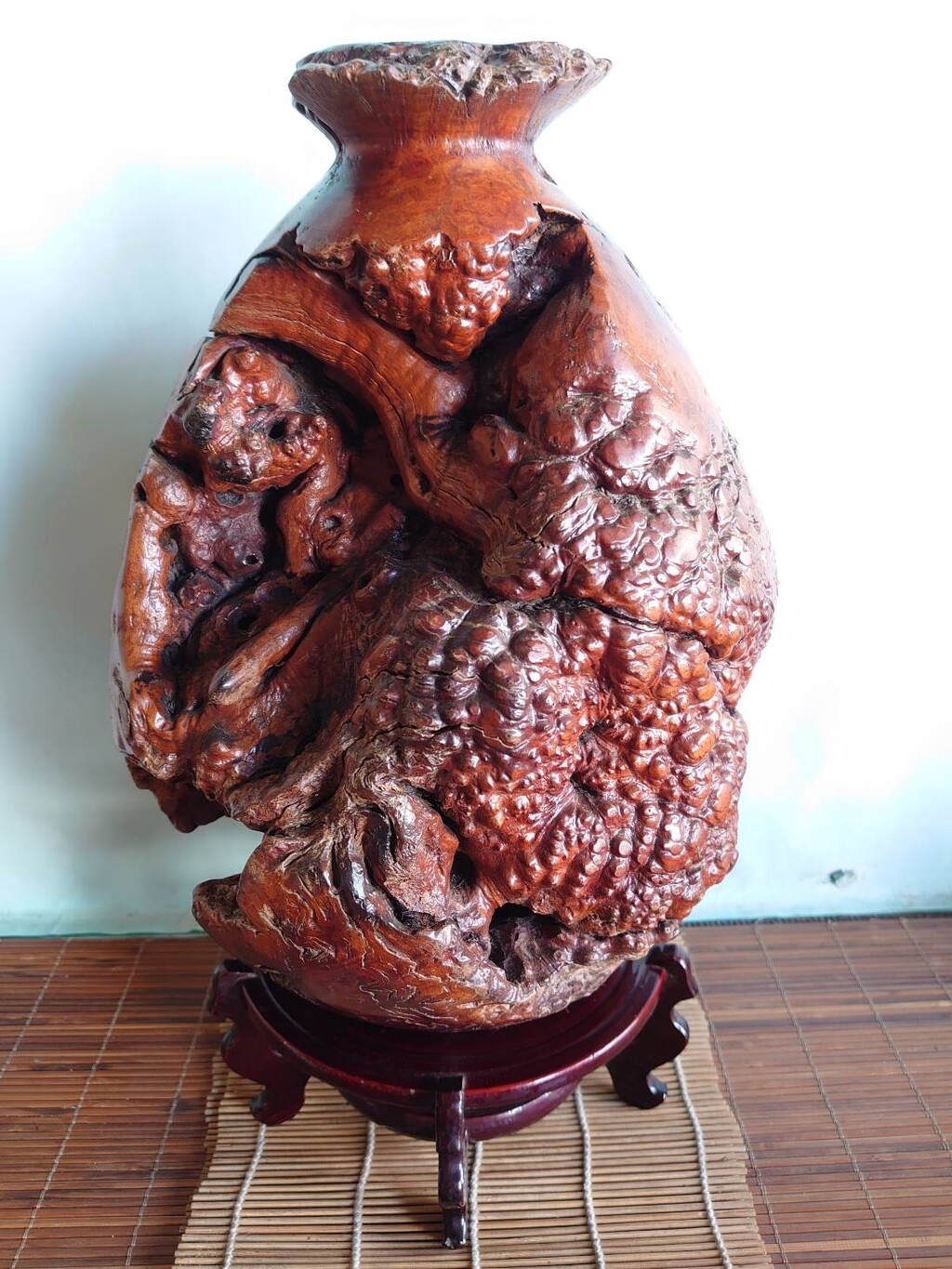 难得杜鹃如此奇特之瘤,保留其自然瘤,车床制作宝瓶之型,上孔可插花表演,上百年方可有此细瘤,造型独特,稀品。