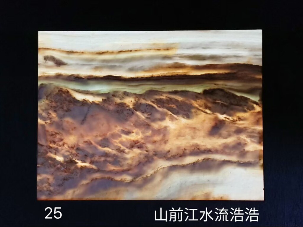 龙云石因地质构造简单明晰,石英质与石灰质相互渗透,乳白、酪黄、墨青等,幻化出浑然天成的图案,线条优美,石色朴质,形构成山峦层叠、波光荡漾的景象。将龙云石薄化至0.5-0.8公分,安上光源,大自然的神妙与不思议将呈现在你眼前。