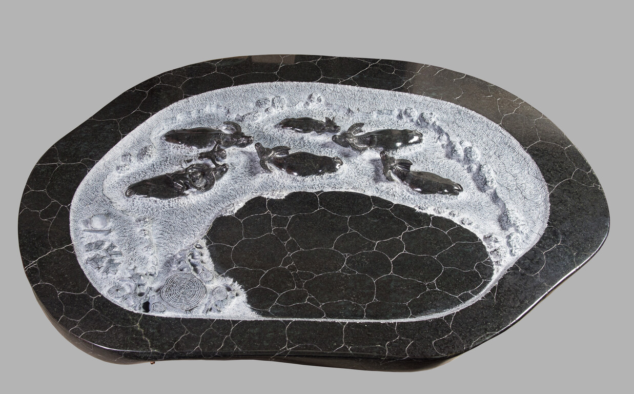 黄栊贤大师创作的石雕茶盘,利用石头本身的特色创作,主题包含本土的牧童放牛、兰花枯木、荷叶金鱼、丝瓜藤蔓、螃蟹泥沼、木纹昆虫等系列,愈发展现过人的雕琢功力。