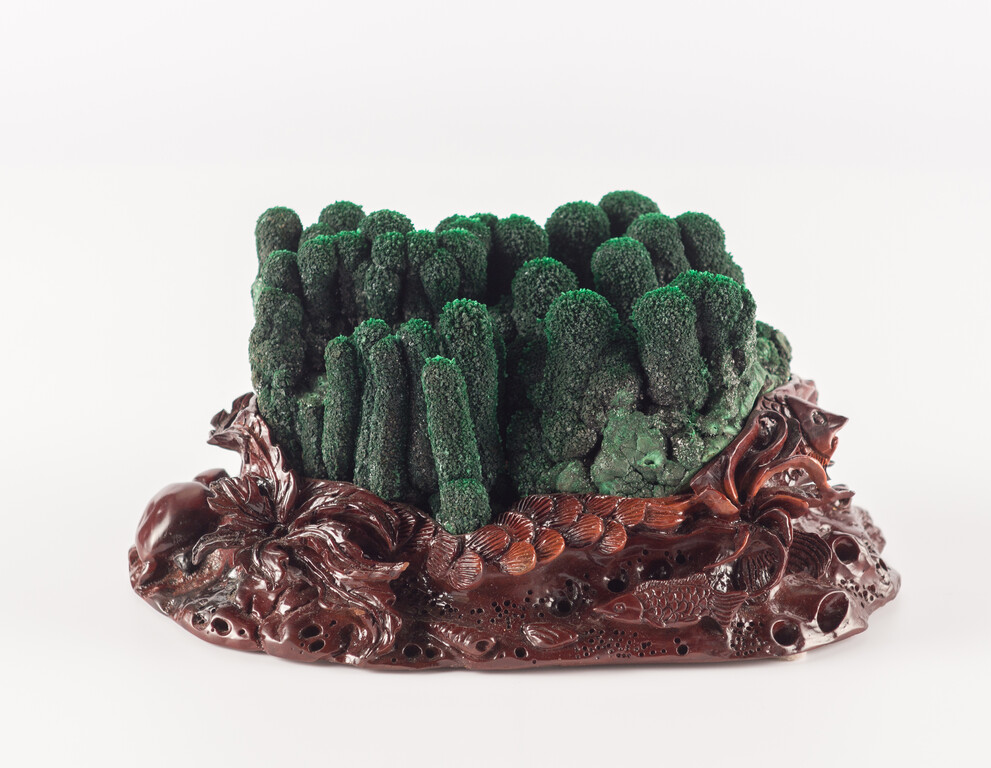 柱状晶体甚为少见,通常以葡萄状、钟乳状、纤维状等集合体产出,内部并具有同心层状或放射纤维状构造。 孔雀石为铜的碳酸盐矿物,其中部分锌可取代铜的位置。若锌含量多时,可称为锌孔雀石。孔雀石溶於盐酸,溶液呈绿色,并有气泡产生。 孔雀石多产於含铜硫化物矿床的氧化带内,属於次生矿物的一种。其颜色与条痕均为绿色,粉末可作颜料之用;质美者,可作为饰品及艺术品;量多时,可提炼铜矿。