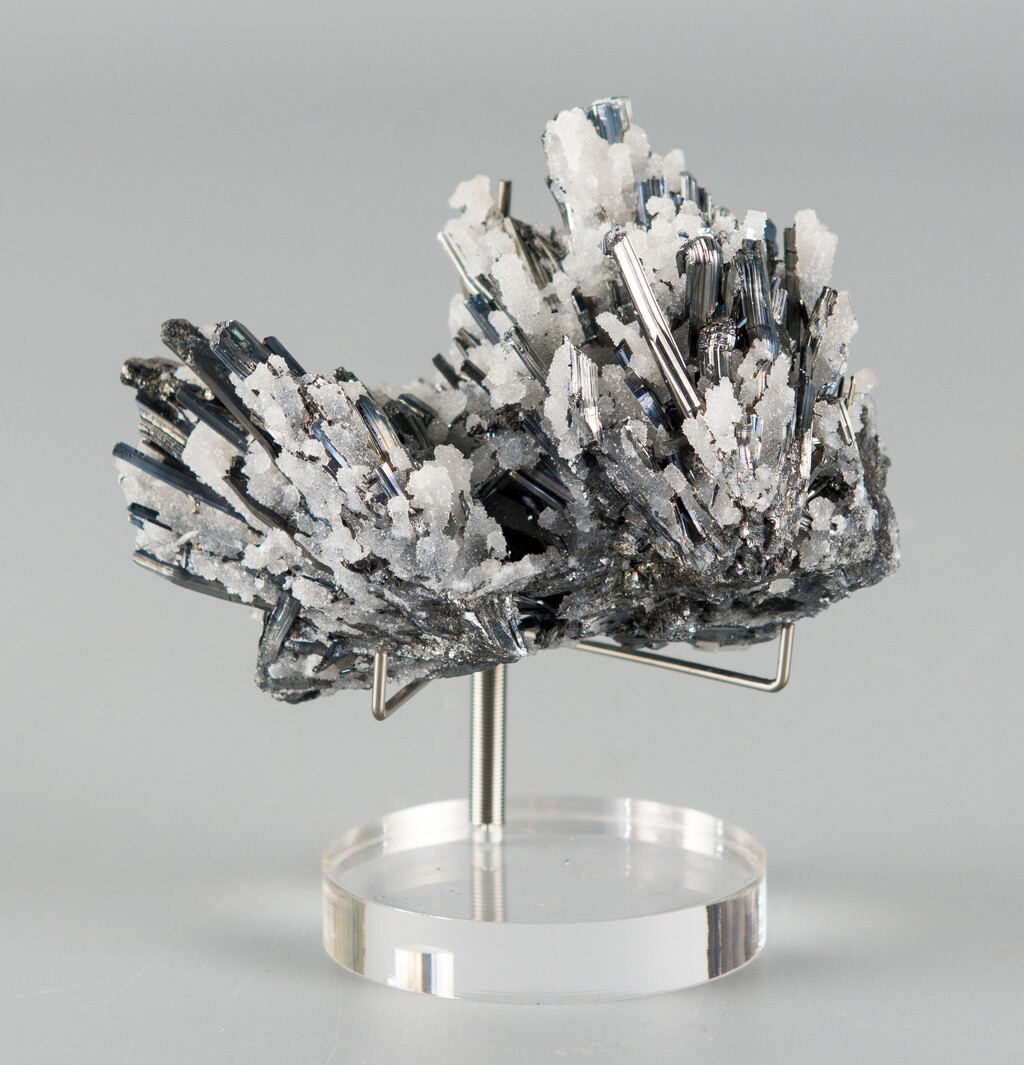 辉锑矿为组成锑矿石的重要有用矿物,晶体呈柱状、针状。颜色和条痕均为铅灰色。金属光泽。相对密度4.6,硬度2-2.5.解理 面上有纹理。形成於低温热液矿床中,常与辰砂、雄黄、雌黄等共生。 其化学成分为三硫化二锑,化学式为Sb2S3。