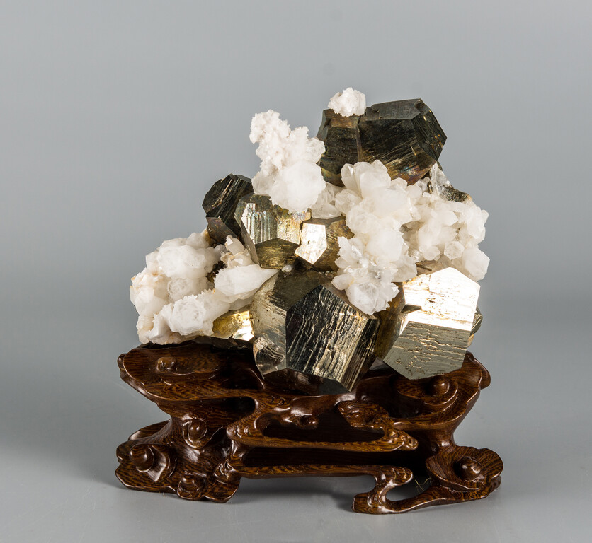 黄铁矿,主要成分是二硫化亚铁FeS2,是提取硫、制造硫酸的主要矿物原料。其特殊的形态色泽,有观赏价值。一些黄铁矿磨制成宝石也很受欢迎。 黄铁矿可经由岩浆分结作用、热水溶液或昇华作用中生成,也可於火成岩、沉积岩中生成。 (摘自维基百科)