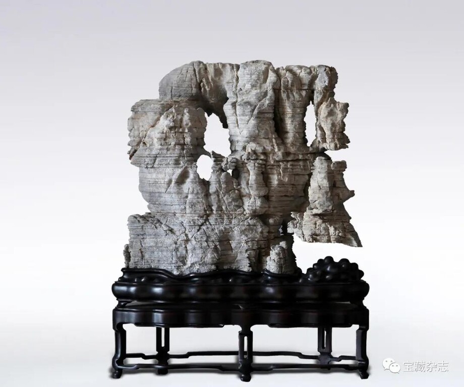 石体右侧上部有一道夹缝,两侧略有凹凸变化,这难道就是当年宋朝孟良紮寨的洞口吗?石上洞口下仿佛有数百道台阶通往山下,站立台阶眺望,“扪萝登去,有鸟道一线,下临万丈,使人毛骨森以寒”。石的右部形成三层台面,一层比一层险要,幽深广远。三层台面高下相间,错落有致。石上斑驳的青灰色和深浅不一的横纹也都派上了用场,那是夹谷台自然朦胧的原貌。博山孝乡久远的遗迹和典故在齐鲁大地上广为流传,而这方湖北景石亿万年後却在博山与夹谷台相遇,那真是不期而遇,天使然也。