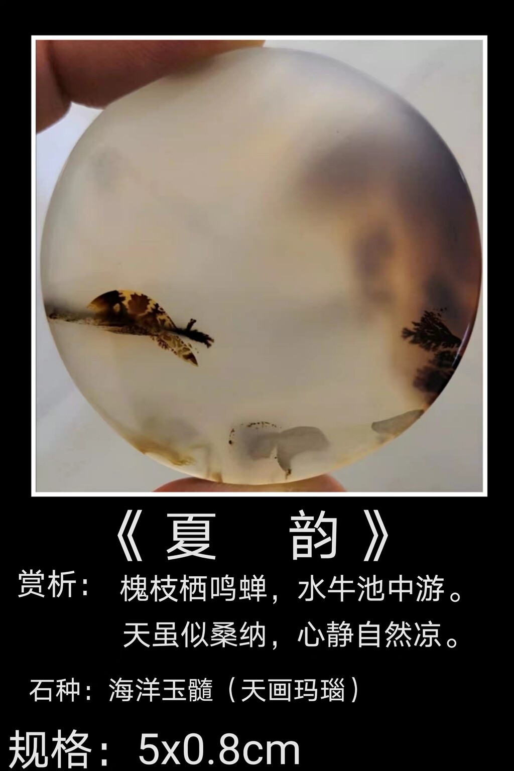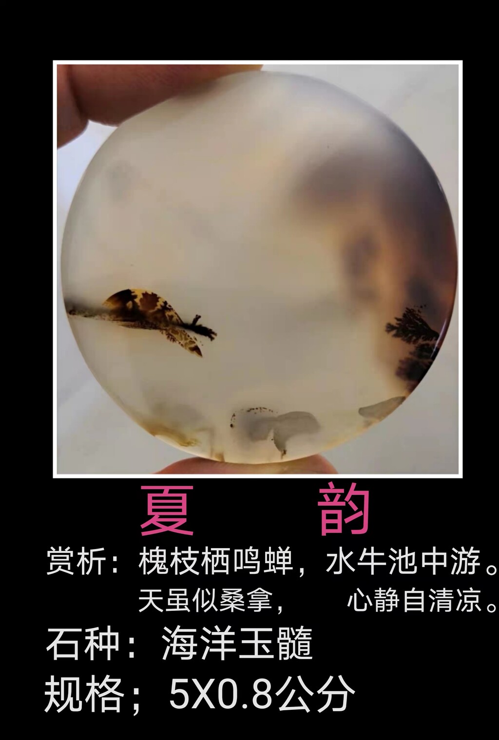 简称海玉,是一种具有丰富色彩、花纹、图案的珍惜玉石。主要成分为二氧化硅具有优质玛瑙属性,均含有天然色彩、花纹和图案。海玉质地温润、通透丰富的色彩、花纹、图案被广泛在奇石收藏领域,每一块海玉都独一无二,或是花鸟虫鱼风景,或是英雄美人典故,或是天地大道传説,其中不乏栩栩如生、惟妙惟肖的作品。