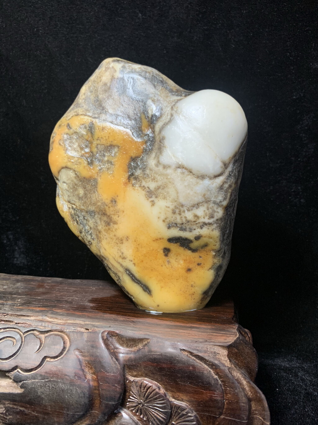 此奇石为新疆和田玉。在天然黄皮和田玉衬托下,一个十分完整的头戴钢盔的战士侧面形象表现出来。我是一个兵,保家卫国。十分珍贵!
