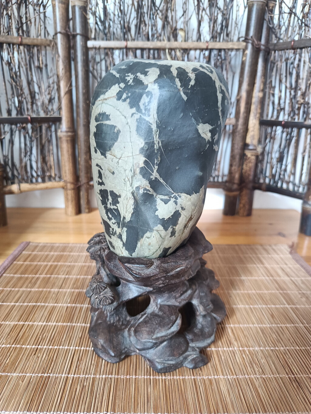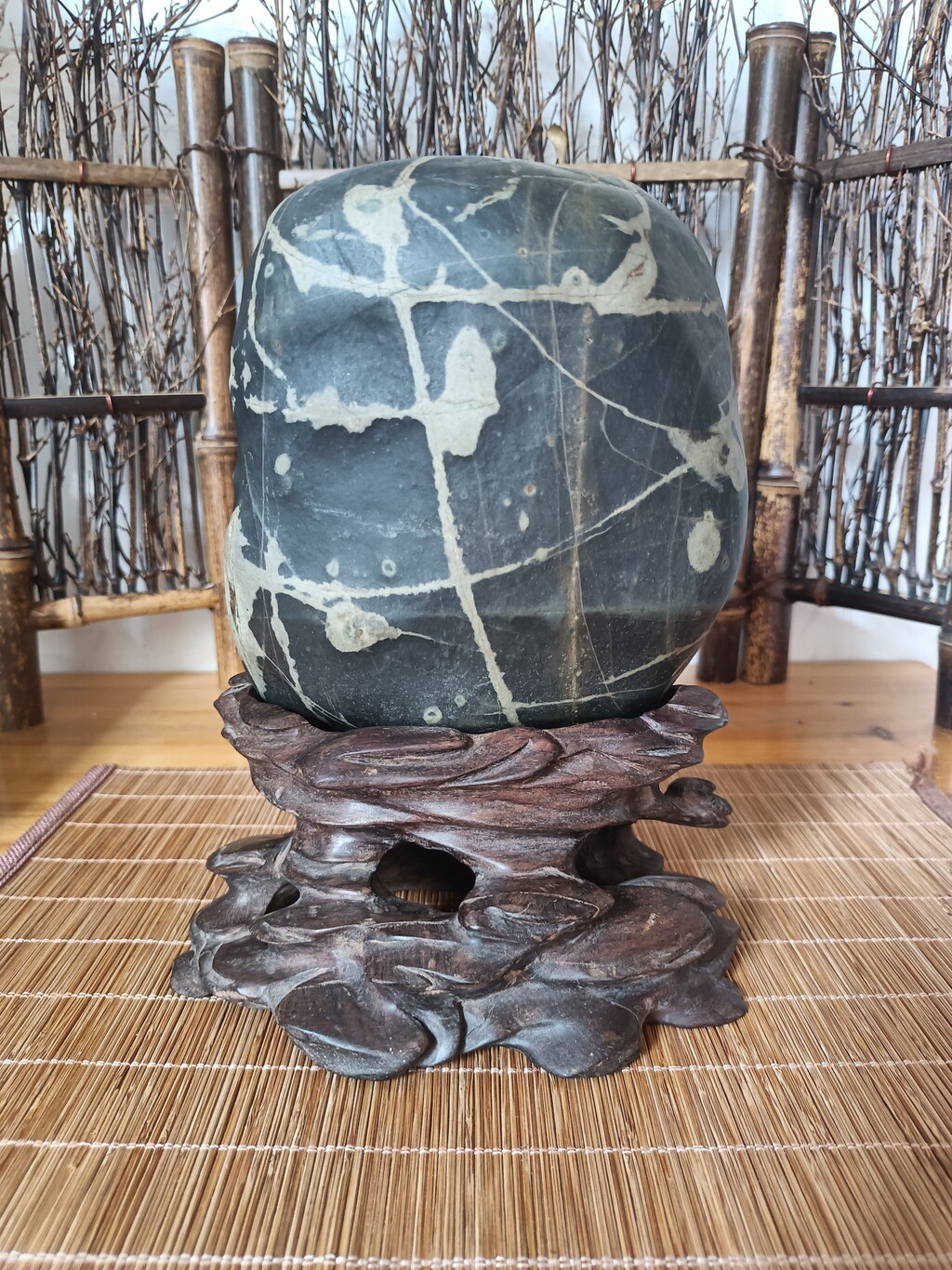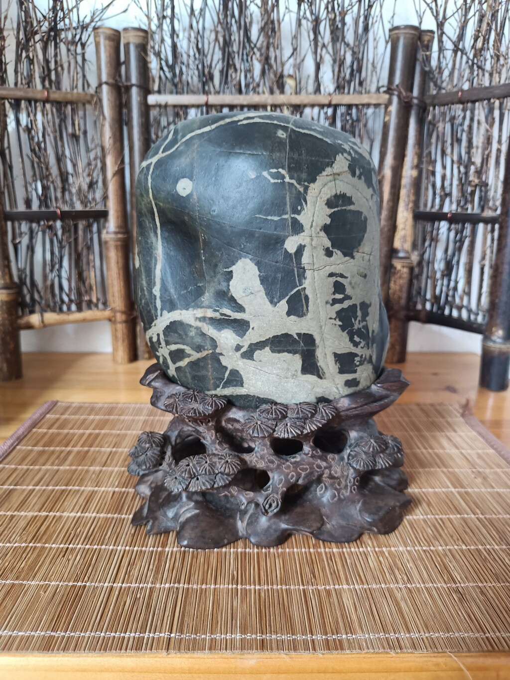 王日辉,福建省上杭县人,2007年开始玩石,现有家庭石馆“劲松阁”。