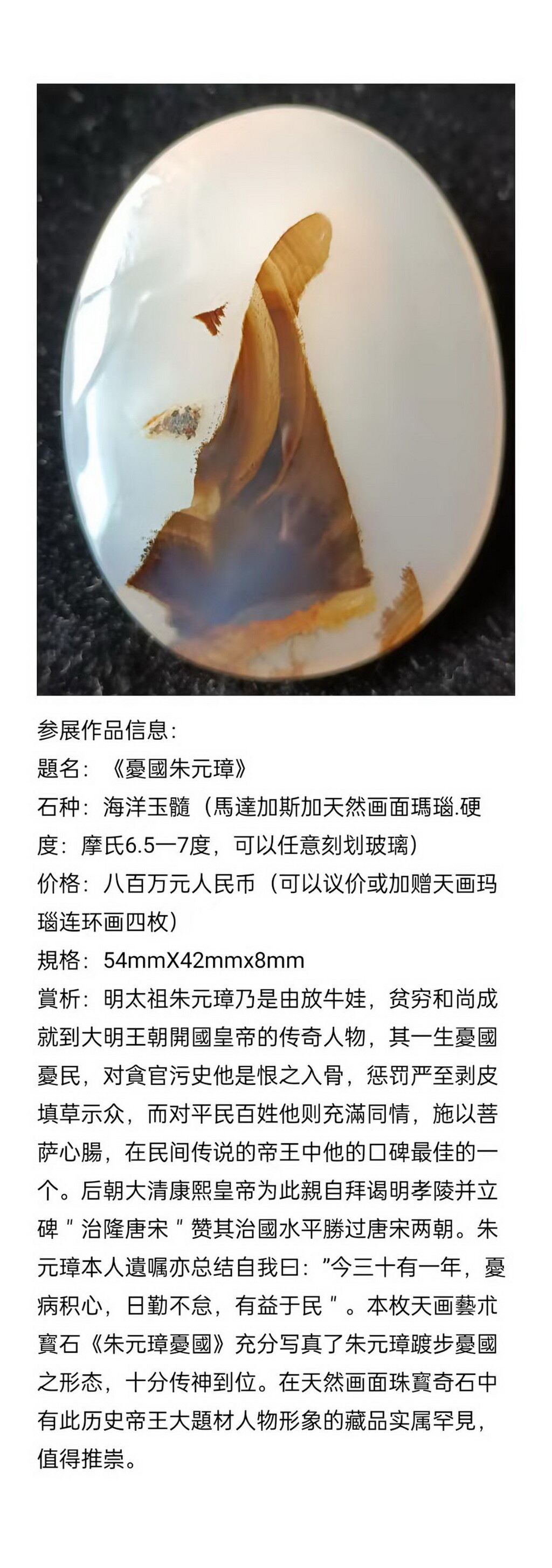 本枚天画艺术寳石《朱元章忧国》充分写真了朱元璋步忧国之形态,十分传神到位。在天然画面珠寳奇石中有此历史帝王大题材人物形象的藏品实属罕见,值得推崇。