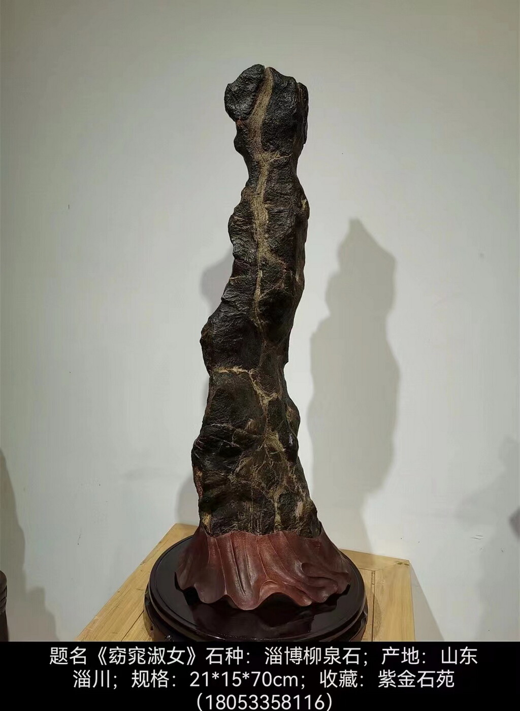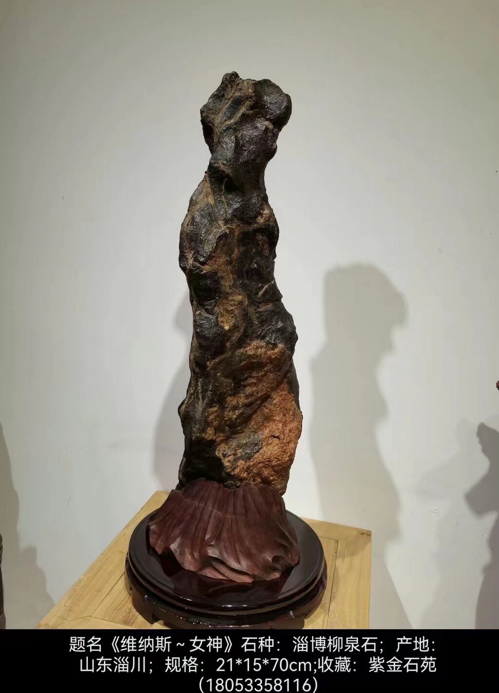 这方产自山东、淄博、淄川蒲松龄故乡的象形人物石,高70厘米。大自然的神工塑造出了两个不同地域和不同人种的两个美女形象;其一面是西方白种人,代表古希腊艺术特有的审美境界,将人类的才能、智慧、情感、精神集中表达出来的女神-维纳斯。另一面是东方黄种人,身材修长,婷婷玉立,在古代先秦《诗经》里就有对东方女性美称的描述名句:“窈窕淑女,君子好逑”。