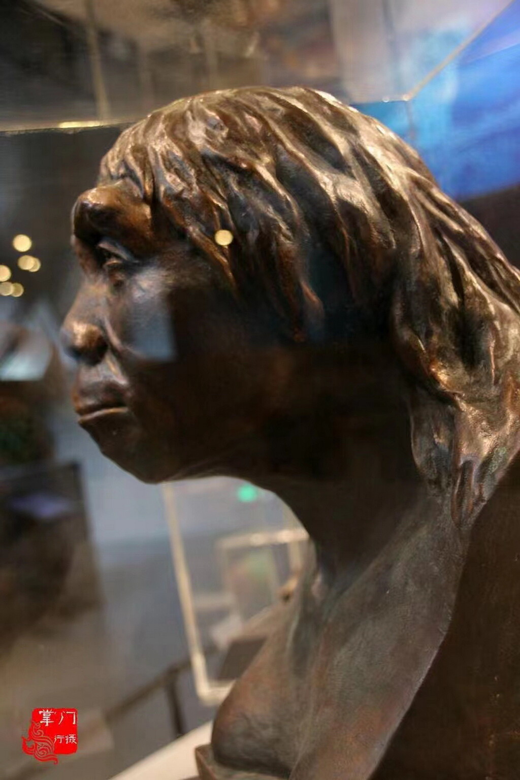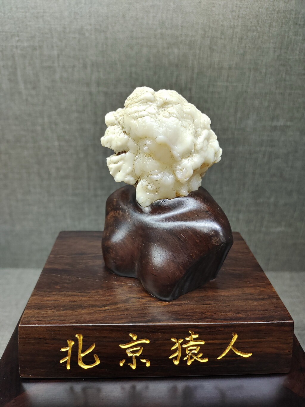 在距今70-20万年前,在北京周口店龙骨山的山洞里,就群居着类人猿-(北京人),他们会利用天然火种,打造石器等工具,会捕猎动物,是具有一些人类行为特徵的类人猿。由於种种原因,北京猿人头骨遗失至今下落不明,这方戈壁玛瑙北京猿人头像形神具备,令人称奇。