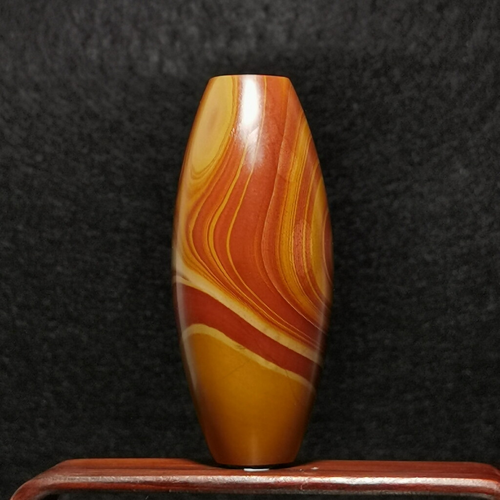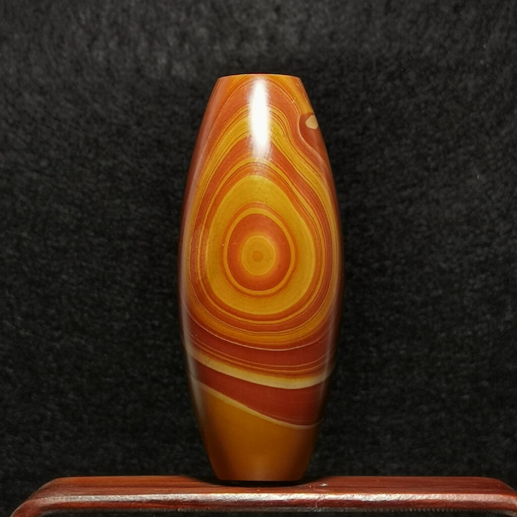 《火眼金睛》,蒙古木纹碧玉,天然原石打磨而成,红黄套色,流水缠丝,背虎牙,出地门线,是一颗火眼金睛的,地门虎牙一眼大供珠,大把件