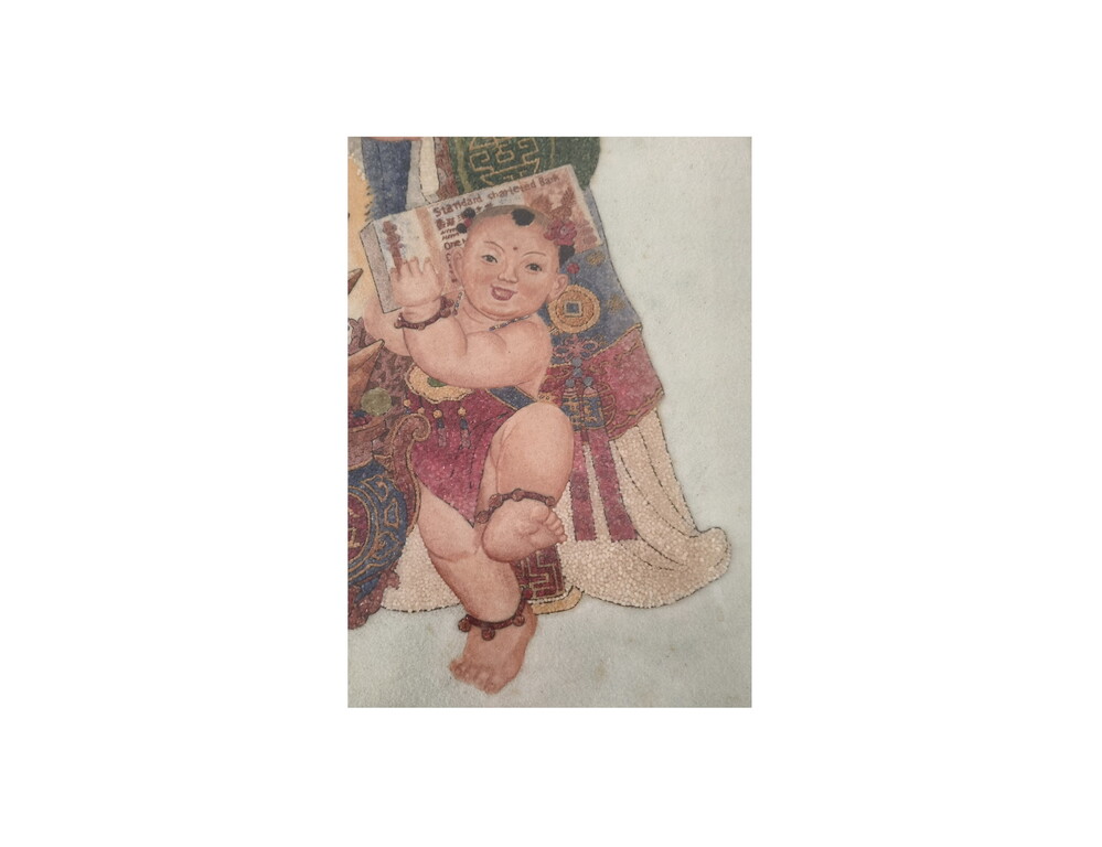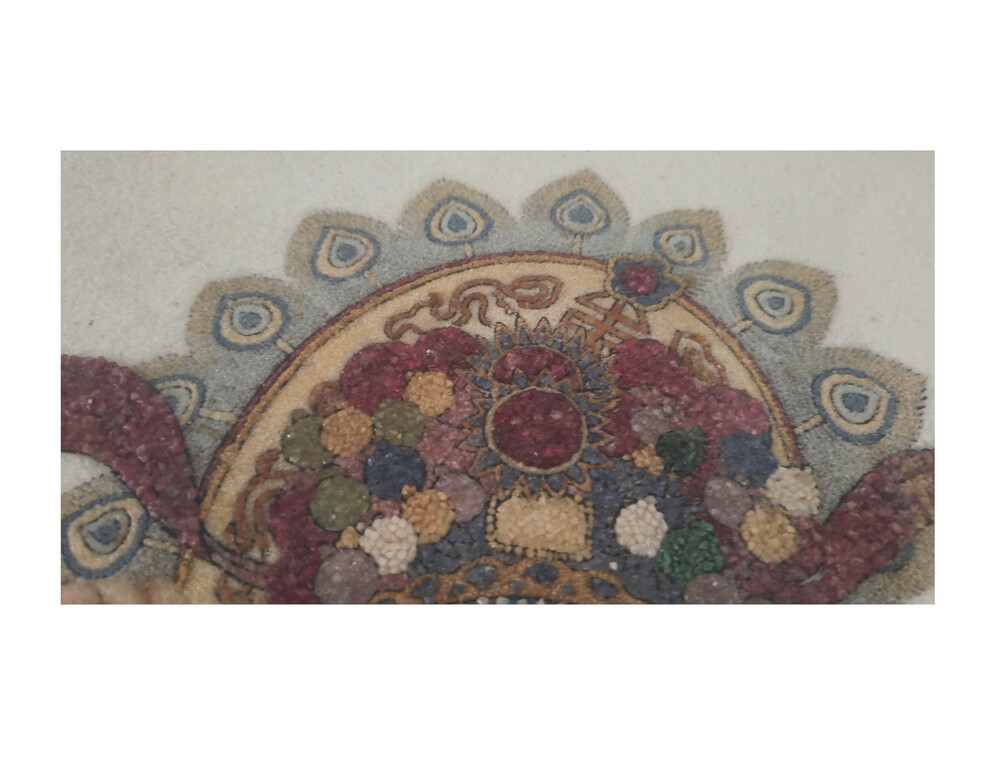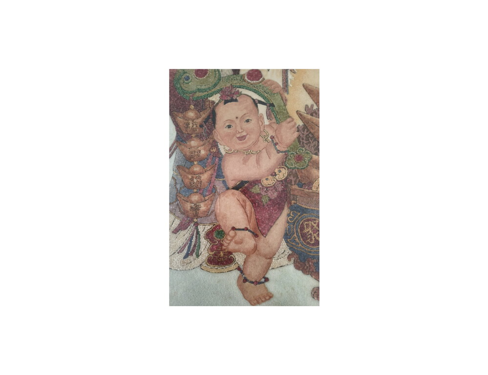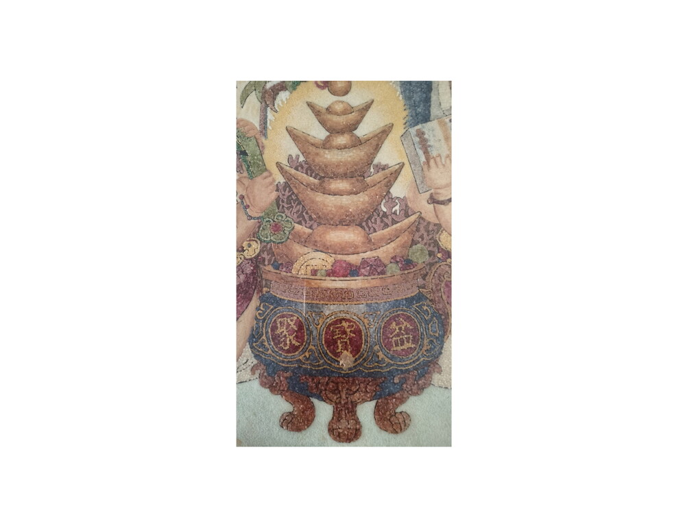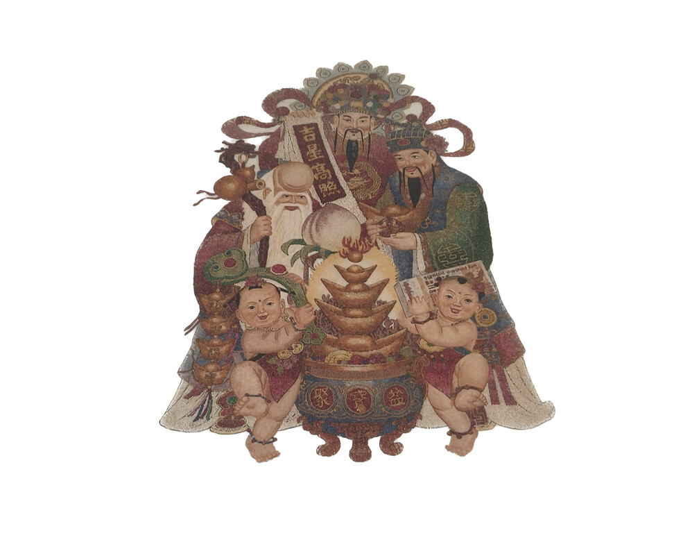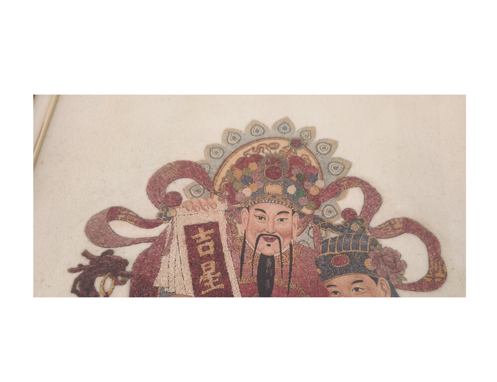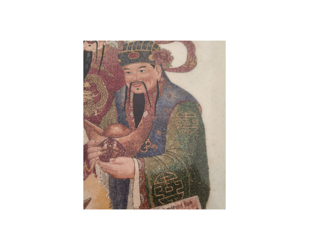 「福禄寿」宝石图,是1988年在缅甸一位95岁的高僧制作,高僧他用手将一粒一粒红、蓝、绿、白不同颜色的碎宝石拼贴,用了9个半月才完成、目前已收藏29年之久。