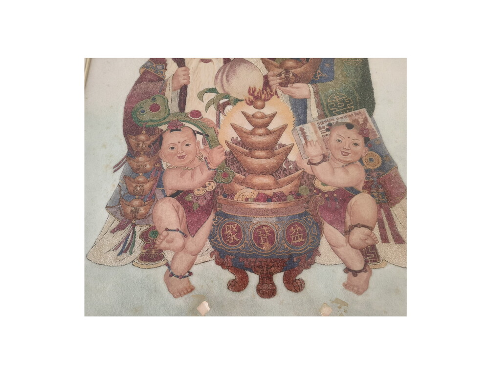 本作品重量8kg(含木框)全都天然的碎石,只有脸部没有碎宝石,其他的部位全都是缅甸天然的碎宝石,依最低的预估纯粹宝石部份应有5kg左右,这幅「福禄寿」宝石图属於「古董艺术品」,依行家告知以目前合湾珠宝行业,要粘这幅画的专业技术人员可能很少,这幅「福禄寿」宝石图有意让藏,等待、寻觅「有缘人」。