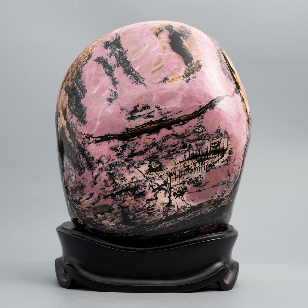 至於,一颗原石的好坏往往取决於研磨抛光的师傅,再因玫瑰石的硬度十分之高,除须具备高超的研磨技巧外,还须有艺术美学的涵养,才能在研磨抛光的同时,保存石中所带有如中国水墨或西方油彩般的山水景致。