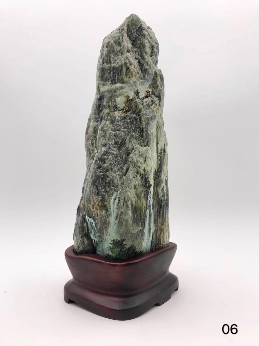 此作系由书画家林正义於台湾玉挥洒创作,原石本身绿色纹理如层层叠翠的山峦,白色纹理如云如水,画家仅轻轻点缀楼阁,即构成令人向往的世外桃源。