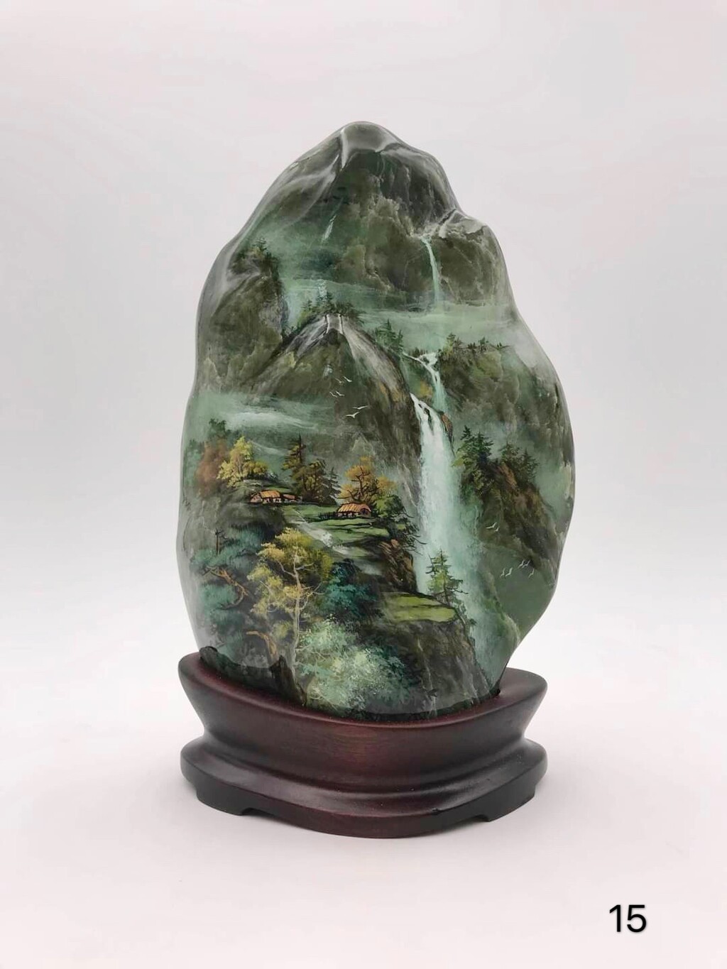 此作系由书画家林正义於台湾玉挥洒创作,利用原石本身的条件底色,赋予作品新的生命。梯田层叠,高低错落,山涧滋养生机,白云穿梭密林,诗意漾荡其间。