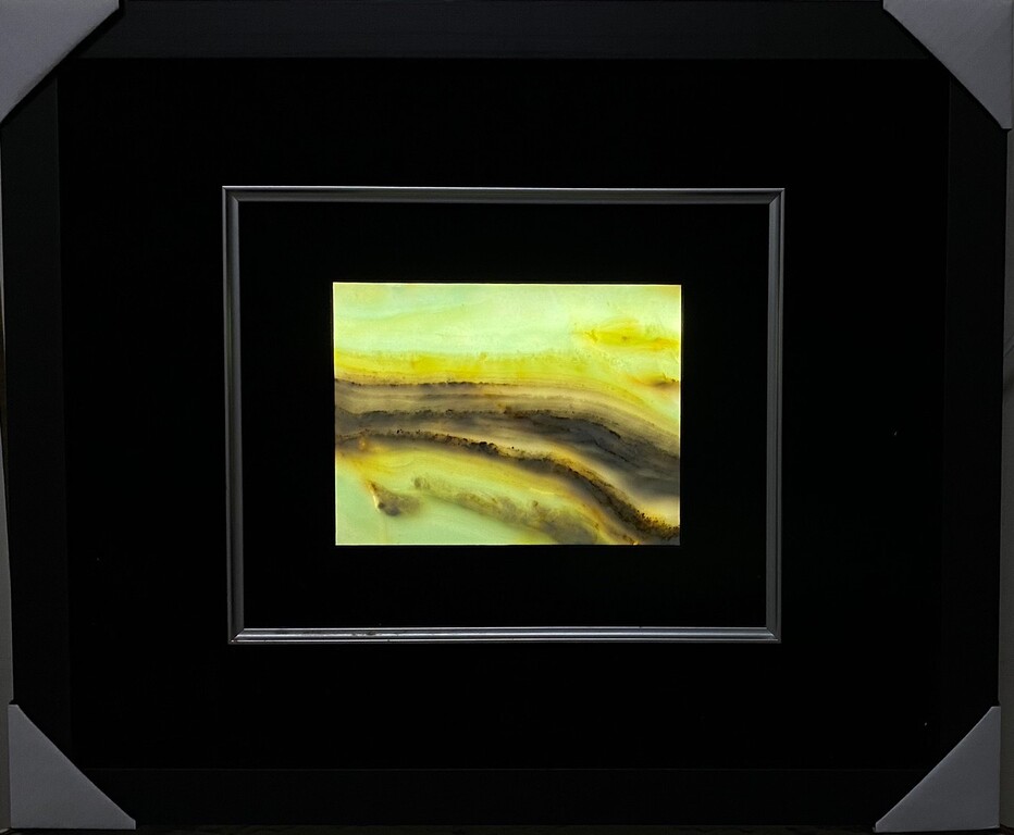 龙云石因地质构造简单明晰,石英质与石灰质相互渗透,乳白、酪黄、墨青等,幻化出浑然天成的图案,线条优美,石色朴质,形构成山峦层叠、波光荡漾的景象。将龙云石薄化至0.5-0.8公分,安上光源,大自然的神妙与不思议将呈现在你眼前。