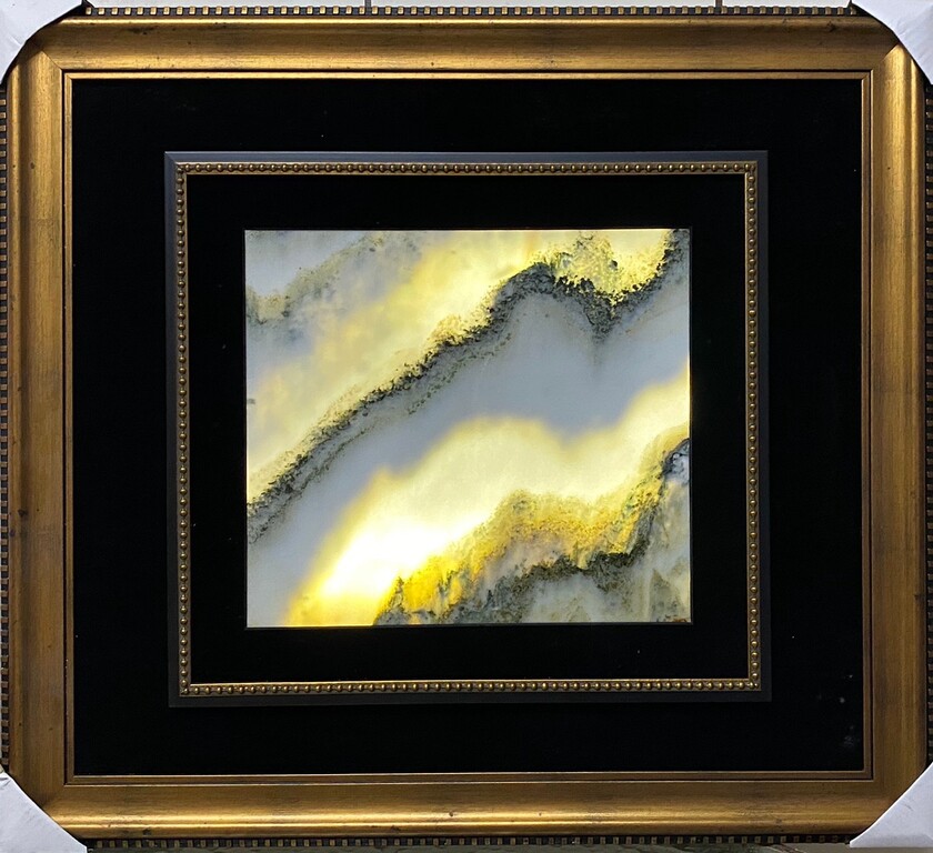 龙云石因地质构造简单明晰,石英质与石灰质相互渗透,乳白、酪黄、墨青等,幻化出浑然天成的图案,线条优美,石色朴质,形构成山峦层叠、波光荡漾的景象。将龙云石薄化至0.5-0.8公分,安上光源,大自然的神妙与不思议将呈现在你眼前。