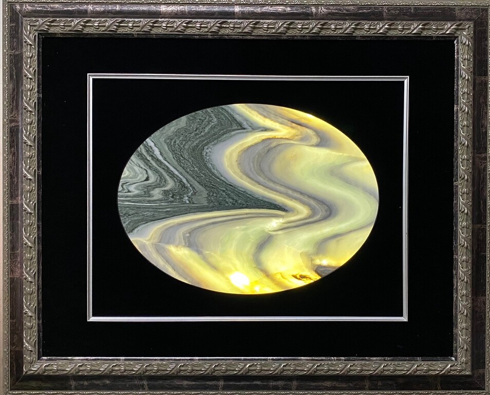 龙云石因地质构造简单明晰,石英质与石灰质相互渗透,乳白、酪黄、墨青等,幻化出浑然天成的图案,线条优美,石色朴质,形构成山峦层叠、波光荡漾的景象。将龙云石薄化至0.5-0.8公分,安上光源,大自然的神妙与不思议将呈现在你眼前。