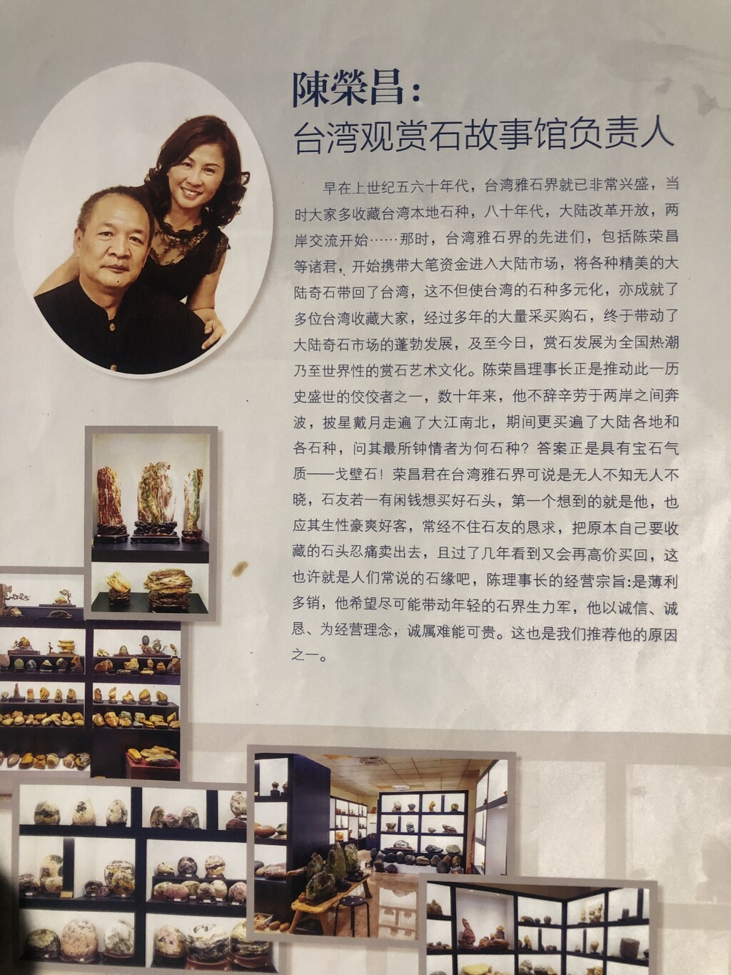 陳榮昌在臺灣雅石界可說是無人不知無人不曉,石友若一有閒錢想買好石頭,第一個想到的就是他,也應其生性豪爽好客,常經不住石友的懇求,把原本自己要收藏的石頭忍痛賣出去,且過了幾年看到又會再高價買回,這也許就是人們常說的石緣吧,陳榮昌的經營宗旨:是薄利多銷,他希望盡可能帶動年輕的石界生力軍,他以誠信、誠懇、為經營理念,誠屬難能可貴。