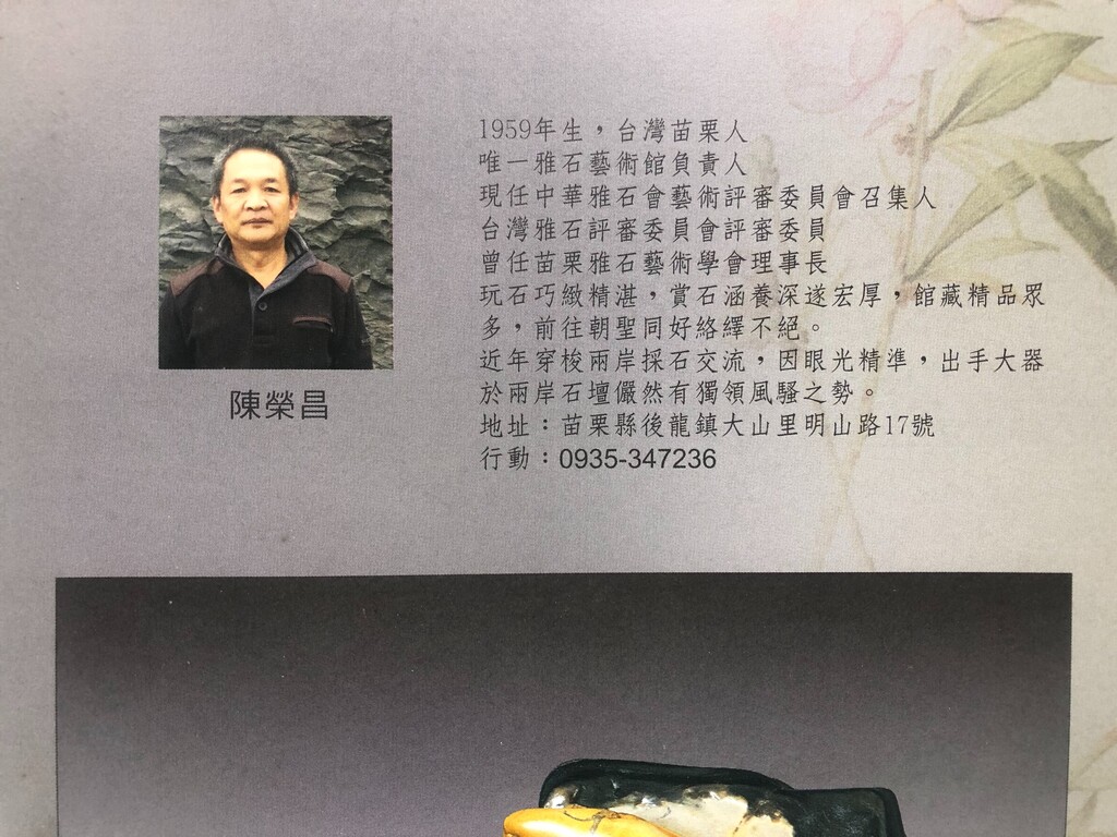 陳榮昌玩石巧繳精湛,賞石涵養深遂宏厚,館藏精品眾多,前往朝聖同好絡繹不絕。近年穿梭兩岸採石交流,因眼光精準,出手大器,於兩岸石壇儼然有獨領風騷之勢。
