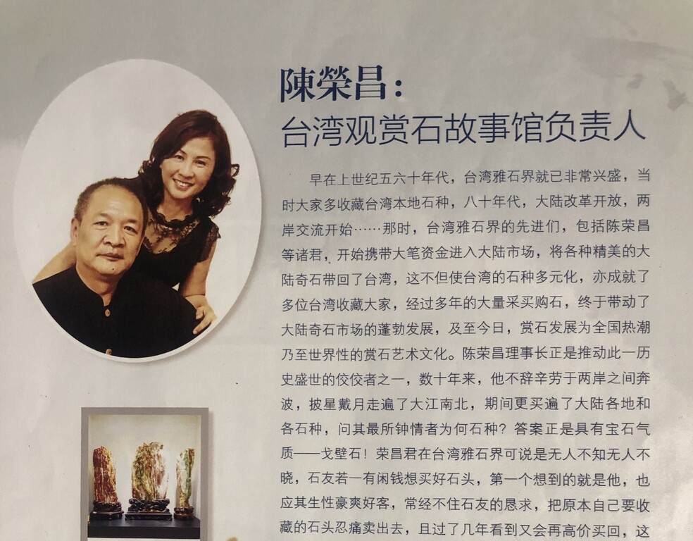 早在上世紀五六十年代,臺灣雅石界就已非常興盛,當時大家多收藏臺灣本地石種,八十年代,大陸改革開放,兩岸交流開始,那時,臺灣雅石界的先進們,包括陳榮昌等人,開始攜帶大筆資金進入大陸市場,將各種精美的大陸奇石帶回了臺灣,這不但使臺灣的石種多元化,亦成就了多位臺灣收藏大家,經過多年的大量採買購石,終於帶動了大陸奇石市場的蓬勃發展,及至今日,賞石發展為全國熱潮乃至世界性的賞石藝術文化。陳榮昌正是推動此一歷史盛世的佼佼者之一,數十年來,他不辭辛勞於兩岸之間奔波,披星戴月走遍了大江南北,期間更買遍了大陸各地和各石種,問其最所鍾情者為何石種?答案正是具有寶石氣質一一戈壁石!