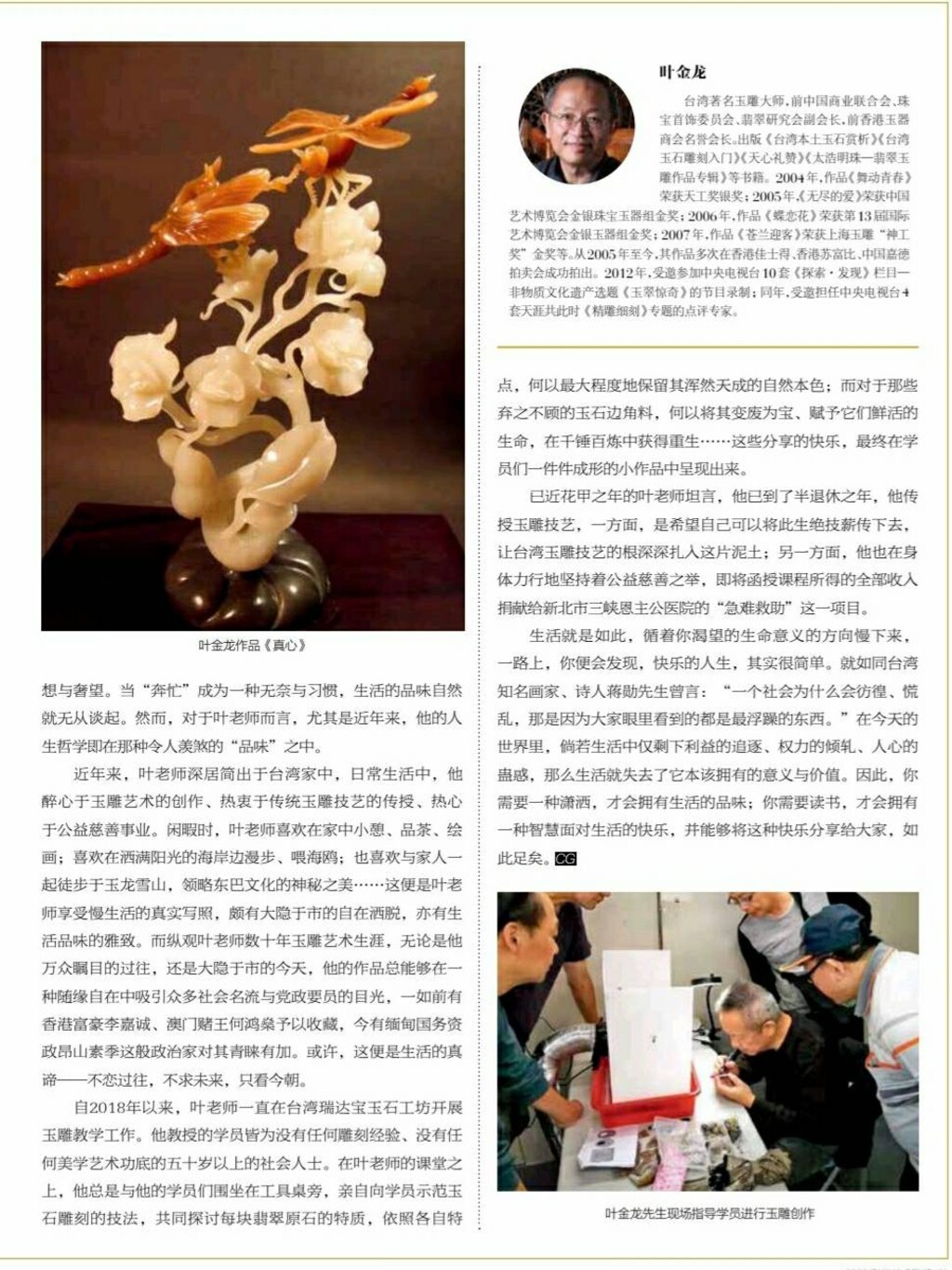 臺灣著名的玉雕大師葉金龍先生,素有“中華鏤空第一人”之稱;從事玉雕工作30多年,善於用建築力學的表現手法,展現出巧奪天工的雕刻技藝;通過對弱小生物的詮釋,來強調對生命的尊重;對藝術執著地追求,讓他的作品體現出強大的生命力。