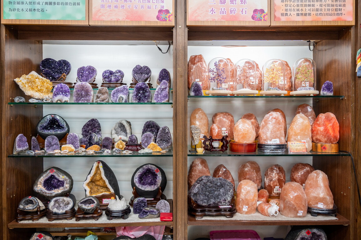 各類招財好物,鹽燈、晶洞、晶鎮、水晶能量飾品客製、手串,各款寶石、翡翠,職人手作設計。