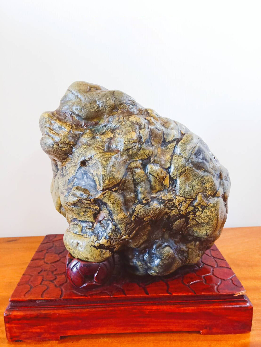 賞析,形象類獸形態,頭右晀望左脚髙踏玉球,坐姿四面八穩 ,頭眼嘴鼻均勻到位,身軀勇壯石肌紋理细明,逼真神韻嘆讚自然造物神奇,能收藏到真是褔氣啦~