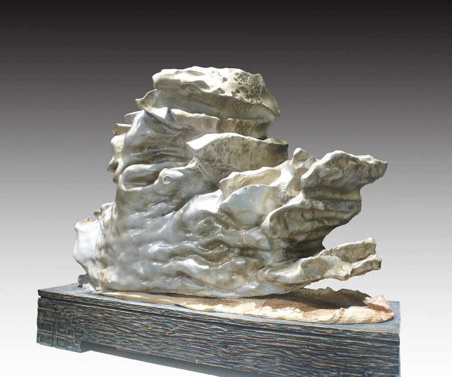玉白菜“遇百財”又叫 “橫財就手”自古以來為中國的富賈貴族們所追捧與喜愛。此方北丹石,于象於神皆似於白菜之形,“葉狀”皺潤、“肌理”具顯,惟妙惟肖,生動逼真。皮質色澤瓷白通亮,玉潤如水。整體既有古樸雅致的韻味,又不失現代雕塑之形象。“玉白菜”躍然于石,不禁聯想“玉財,遇財,馭財......”