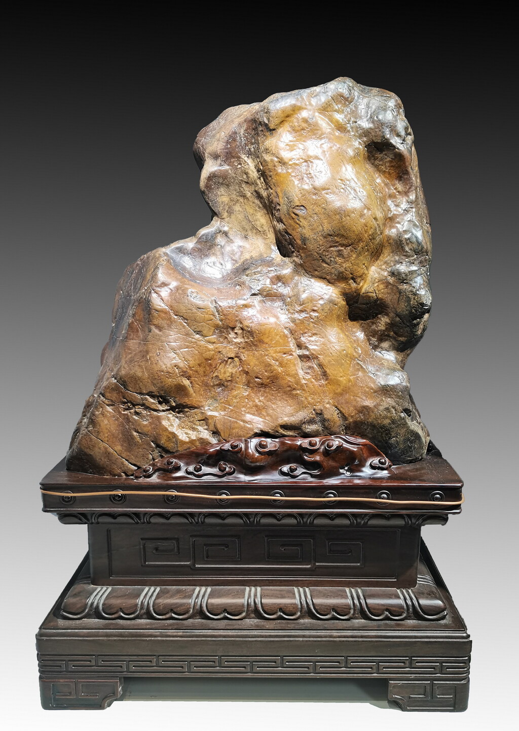 此方藏品色澤古銅,石質堅硬,石皮六面光滑,包漿濃厚光潤。形似一深居草原的雄獅,鬃毛舞動,身姿雄健。回首間儼然王者風範。