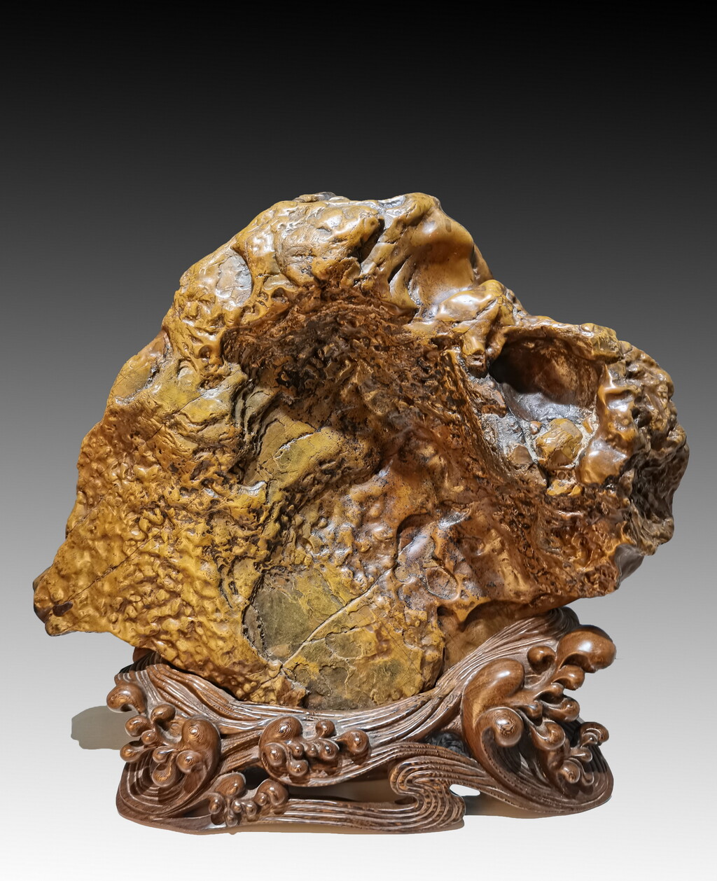 此尊美石通身玻璃皮,包漿古樸厚重,手感舒潤。形似一條金魚,魚鱗狀的石膚,腹部的石膚黃中透綠,精美如瓷,動感十足,惟妙惟肖。寓意吉祥,財源滾滾,人丁興旺。