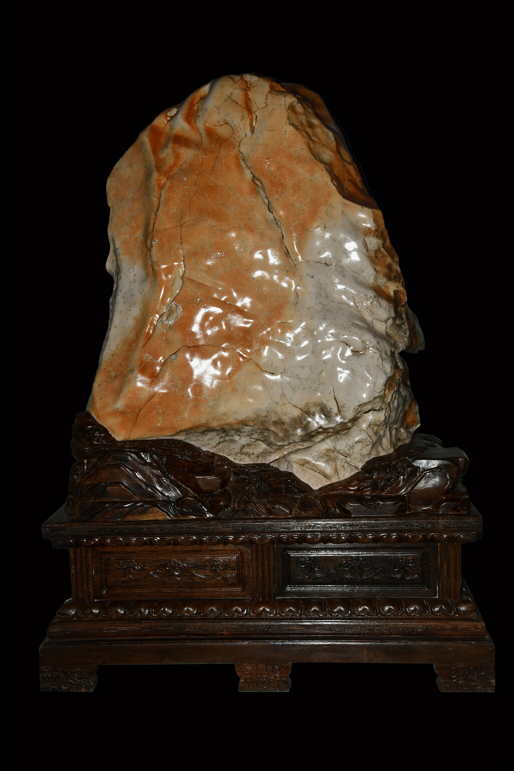 石質緻密,富含光澤,質感瑩潤,可以與陶瓷釉面相媲美表面的條痕、線紋,粗細深淺變化多樣,看上去極似窯變的蚯蚓線。尤其是石表大小起伏、層次分明的紋片,就像哥窯瓷器上的開片,美不勝收。
