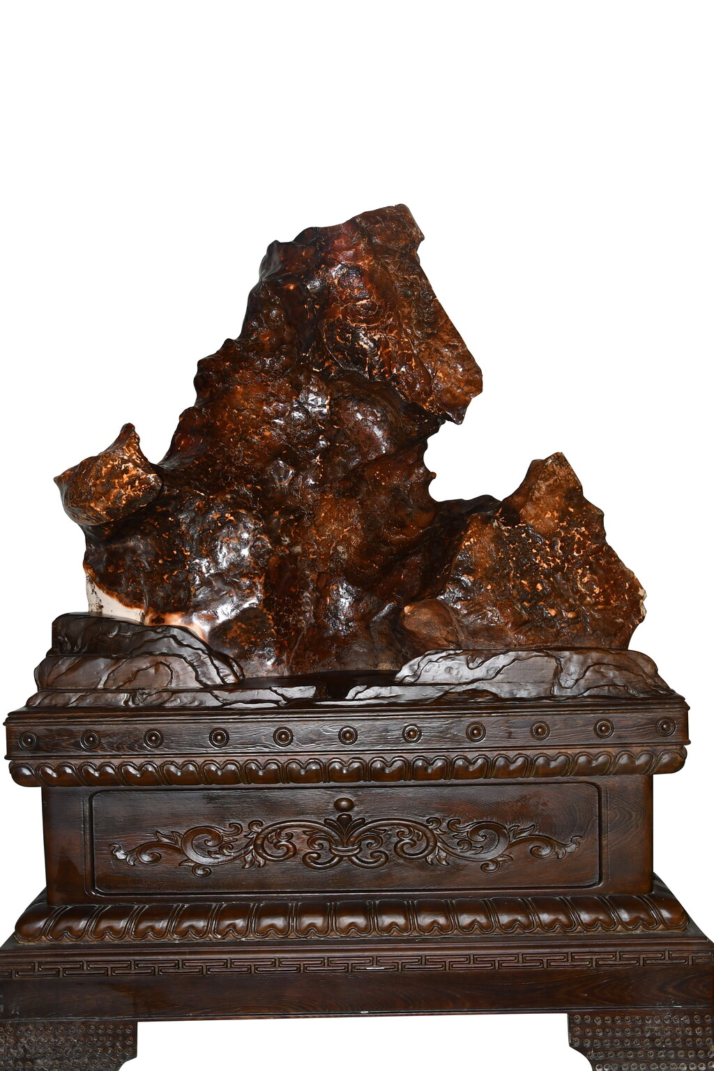 石質緻密,富含光澤,質感瑩潤,可以與陶瓷釉面相媲美表面的條痕、線紋,粗細深淺變化多樣,看上去極似窯變的蚯蚓線。尤其是石表大小起伏、層次分明的紋片,就像哥窯瓷器上的開片,美不勝收。