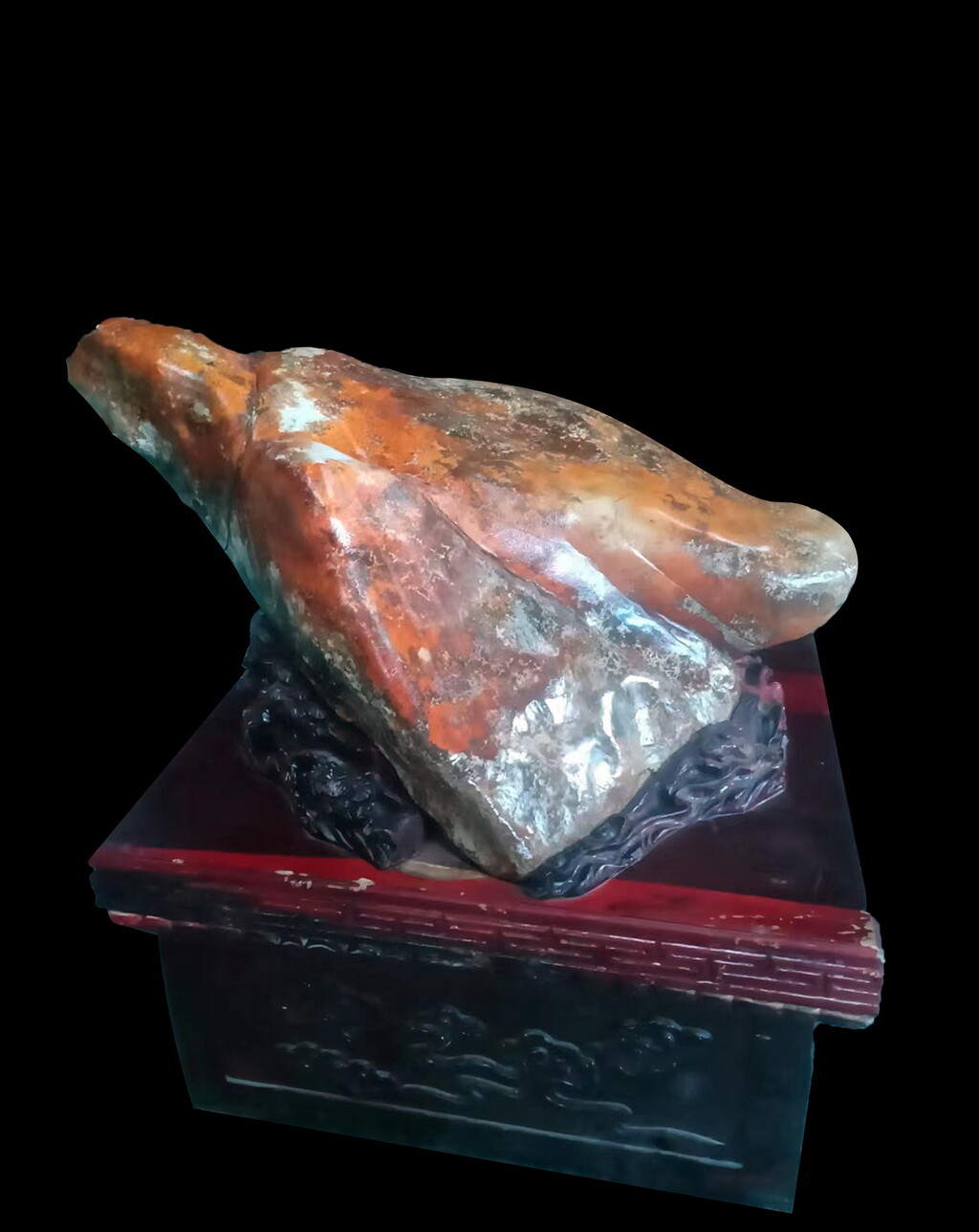 石質緻密,富含光澤,質感瑩潤,可以與陶瓷釉面相媲美表面的條痕、線紋,粗細深淺變化多樣,看上去極似窯變的蚯蚓線。尤其是石表大小起伏、層次分明的紋片,就像哥窯瓷器上的開片,美不勝收。