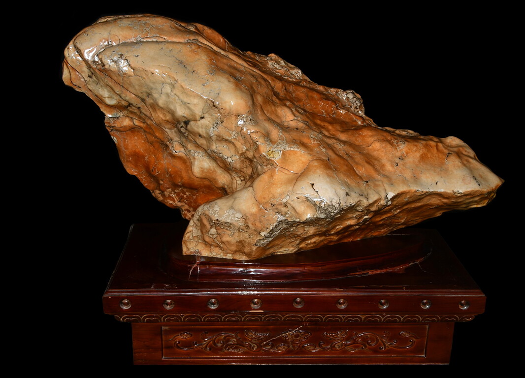 石質緻密,富含光澤,質感瑩潤,可以與陶瓷釉面相媲美表面的條痕、線紋,粗細深淺變化多樣,看上去極似窯變的蚯蚓線。尤其是石表大小起伏、層次分明的紋片,就像哥窯瓷器上的開片,美不勝收。