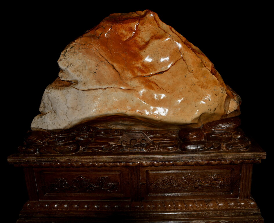 石質緻密,富含光澤,質感瑩潤,可以與陶瓷釉面相媲美表面的條痕、線紋,粗細深淺變化多樣,看上去極似窯變的蚯蚓線。尤其是石表大小起伏、層次分明的紋片,就像哥窯瓷器上的開片,美不勝收。