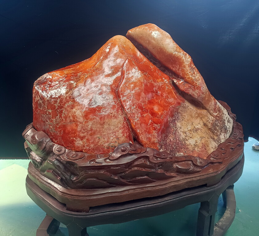 石質緻密,富含光澤,質感瑩潤,可以與陶瓷釉面相媲美表面的條痕、線紋,粗細深淺變化多樣,看上去極似窯變的蚯蚓線。尤其是石表大小起伏、層次分明的紋片,就像哥窯瓷器上的開片,美不勝收。