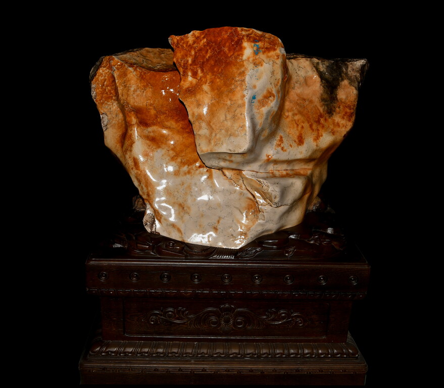 石質緻密,富含光澤,質感瑩潤,可以與陶瓷釉面相媲美表面的條痕、線紋,粗細深淺變化多樣,看上去極似窯變的蚯蚓線。尤其是石表大小起伏、層次分明的紋片,就像哥窯瓷器上的開片,美不勝收。