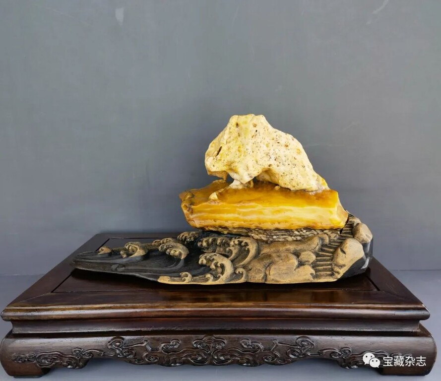 如果說此石為戈壁黃龍玉風礪石共生體的特殊石種已讓人驚異的話,那一隻石蟾神色迷離地蹲坐在波紋起伏的自帶座上,仿佛陷入了深深的沉思的造型,就更讓人感到不可思議了!藏家因勢利導,配以浪花翻卷的摟雕木座,讓“濤聲依舊”的命題格外貼切、雋永。