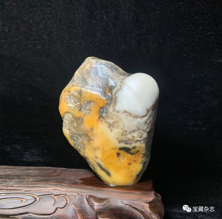 此奇石為新疆和田玉。在天然黃皮和田玉襯托下,一個十分完整的頭戴鋼盔的戰士側面形象表現出來。我是一個兵,保家衛國。十分珍貴!