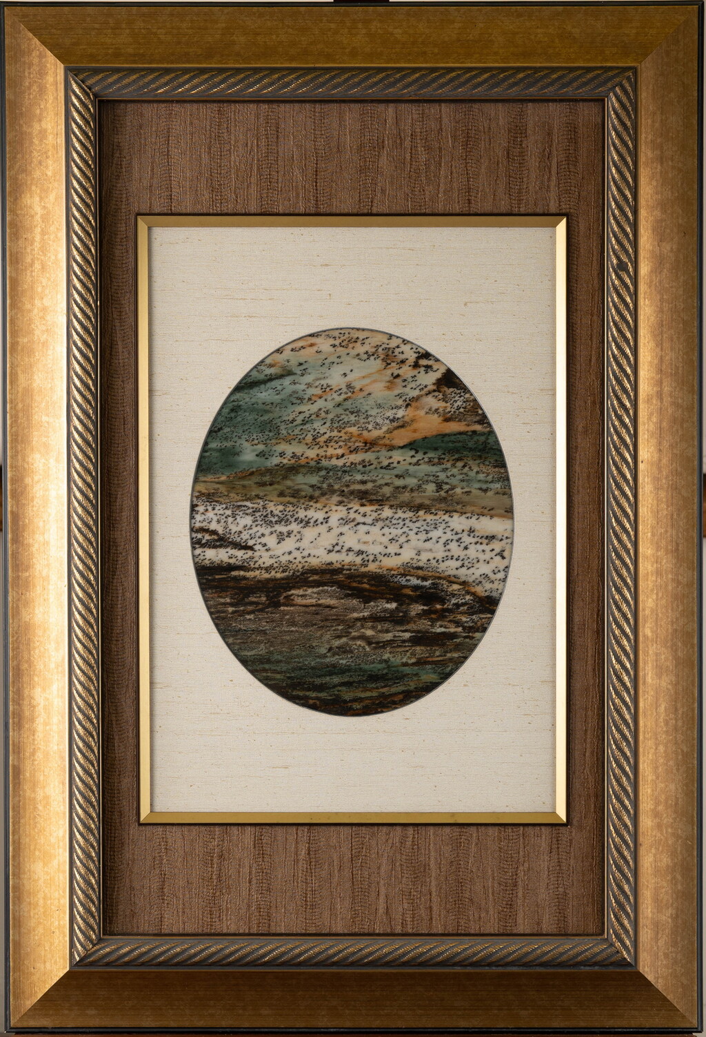 以瞳孔視覺設計圓型舒適之石畫,內藏三彩多色變化,取之精華部分,天景、山景及河川、地景為主題材相當漂亮的搭配,峽谷中成群的飛鳥點綴出景觀裡生命的活躍,整件作品景致佈局完美之石。
