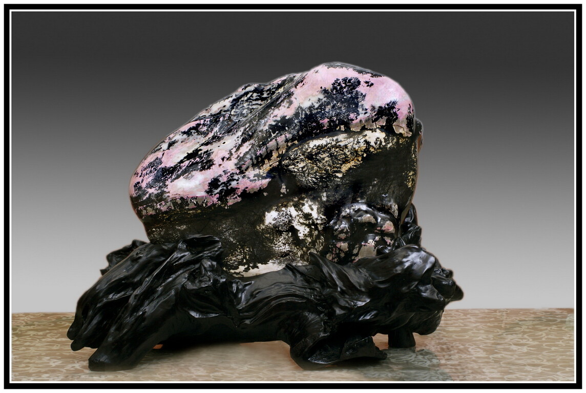 玫瑰石,學名薔薇輝石岩(Rhodonite),摩氏硬度5.5-6.5,三斜晶系。
