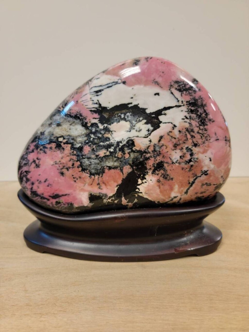 玫瑰石,學名薔薇輝石岩(Rhodonite),摩氏硬度5.5-6.5,三斜晶系。