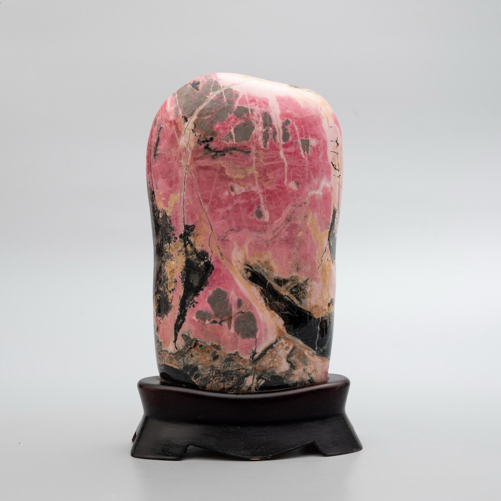 玫瑰石,學名薔薇輝石岩(Rhodonite),摩氏硬度5.5-6.5,三斜晶系。