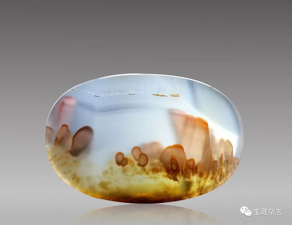 海洋玉髓,是一種具有豐富花紋、圖案的珍貴寶石和稀有觀賞石。唯一產地是“寶石之國”非洲島國馬達加斯加。主要化學成分是二氧化矽SiO₂,呈緻密塊狀和球粒狀、放射狀或細微纖維狀集合體,屬於底色均一的隱晶質石英。鐵(Fe) 、錳( Mn) 等致色元素在海洋玉髓中沉積、滲透,形成了各類圖案。海洋玉髓常被錯認成水草瑪瑙、巴西瑪瑙。海洋玉髓除各種姿態的草花品種外,還有哈子、龍紋、管子、髮絲、弧帶等品種。多品種圖案聚合一體,是海洋玉髓最大的特色,並使它成為令人著迷的蘊含多種文化元素的藝術寶石。
